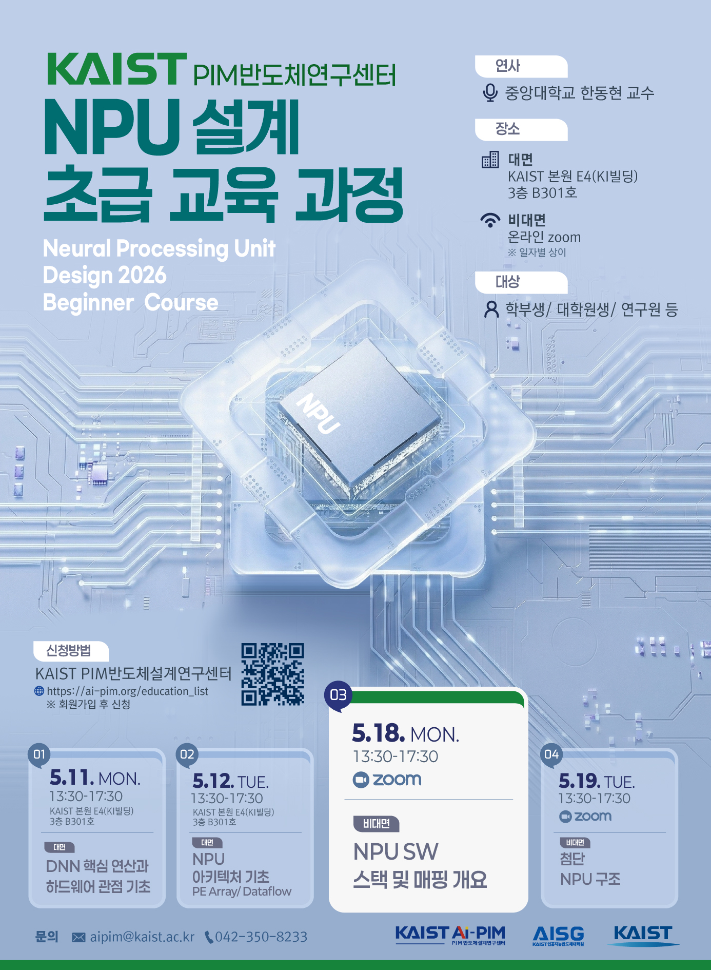 - 5/12 (화) NPU 아키텍처 기초 (PE Array/Dataflow) -> 수강신청 바로가기