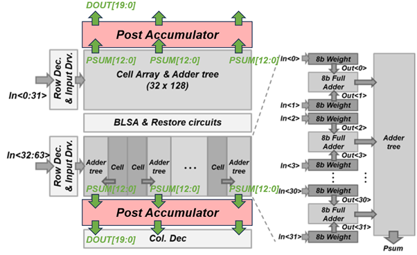 The proposed post-accumulator is used in the MAC operation process, which receives bit-serial input and accumulates the MAC results generated in each cycle by reflecting the bit positions of the 8-bit input activation. This circuit takes a 13-bit MAC result as input, adds it to the result from the previous cycle, and left-shifts the summed result by 1 bit to align with the bit position of the next cycle's input. This process is repeated over 8 cycles, ultimately generating a 20-bit output.